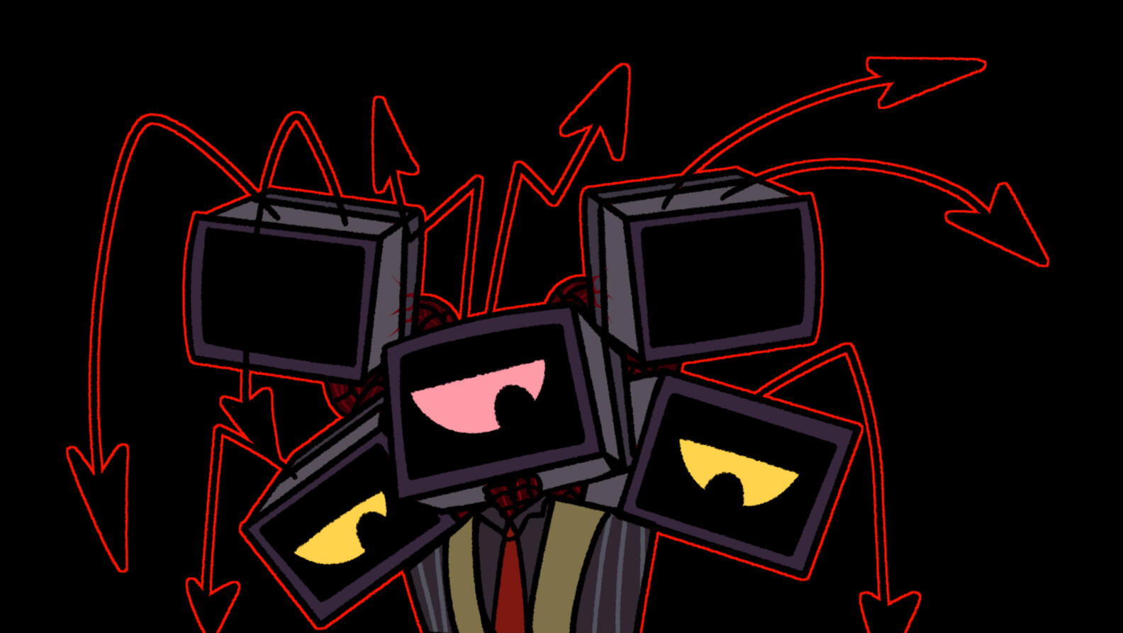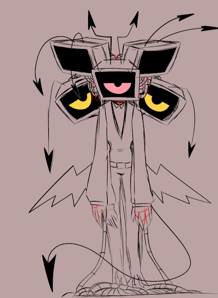 A version of Tenna consumed by the Shadow Crystal. She has the ability to watch over all timeline. Her interior workings are functioned by red wires that link to the Crystal as her core.The multiple screens all can show anything, but usually the bottom three display eyes of some assort.She can summon minions in the form of spiderlike camera drones. They resemble the security cameras but with spiderlike legs and they can move around. All of her antennae are arrow-pointed now, along with her tail.Her wings are made of pure dark energy. She cannot fly with them.She seems to speak in a somewhat broken way, often pointing things out in ways that are 'matter-o-factly' or written like "You are: This".She has an extreme disgust for her other seles, and dislikes spamton for 'not being able to save her'.This instance of her also seems to have killed her variant of Mippins when Mippins tried to save her from reaching this state.